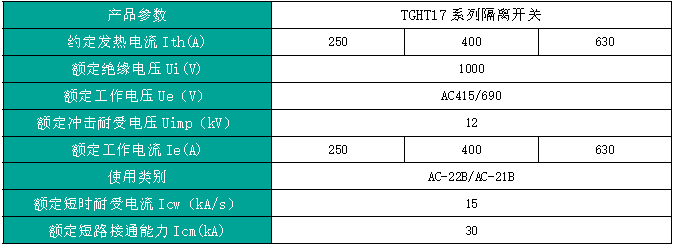 TGHT17 系列隔离开关,主要用于额定电压AC415V/AC690V (50Hz),约定发热电流至630A 的配电电路和电动机电路中,作为电源开关、隔离开关、应急开关,但不作为直接启、停电动机之用。符合标准:GB/T 14048.3